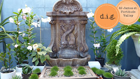 Ornate garden sculptures aren't usually my thing but I think the catfish on this one make it a little more kitschy. A feature table of potted plants is such a good way to dress up a concrete wall.