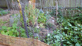 In other news, our little tomato plants were outgrowing their mesh huts, so I fashioned some larger protective cages for them.