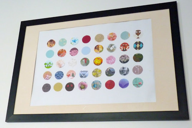I picked a glass the right size and traced the circumference on the front of each card. I cut a variety of different images, some deliberate, some abstract, with different textures and colours, and played around with the placement until I was happy with how it looked. I love that there's a chicken in there, and Mick Jagger's lips too.